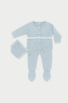 - Blue and white wool set: knitted all-in-one with collar & bonnet