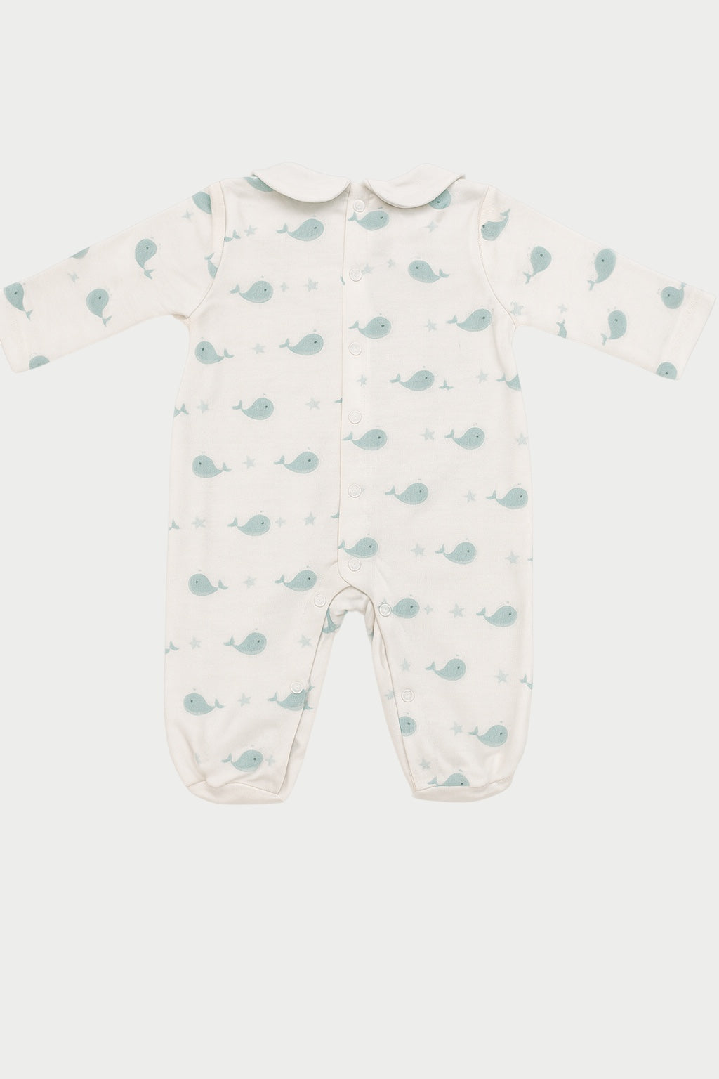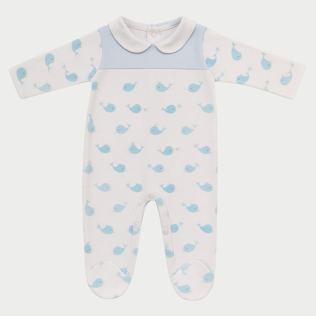 - 100% cotton all-in-one in white with light blue print