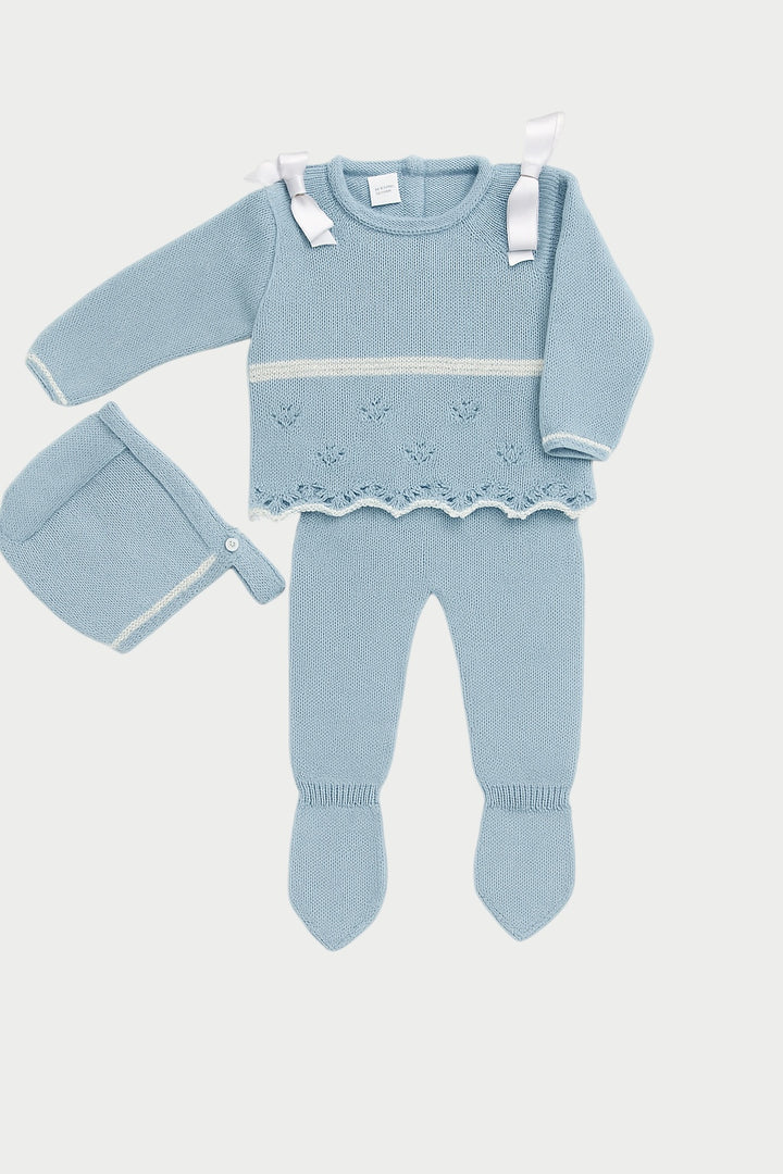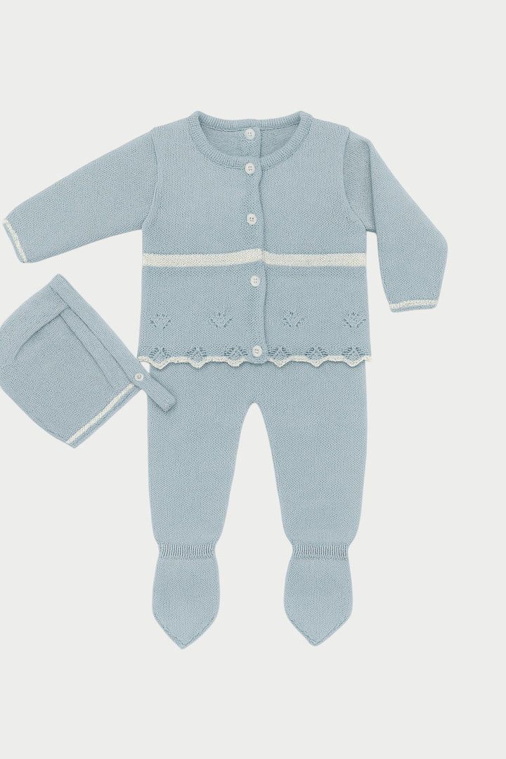 - Sweet blue wool set: knitted all-in-one with collar & bonnet