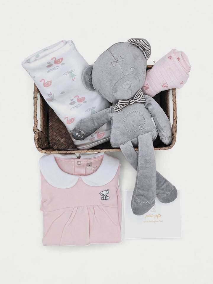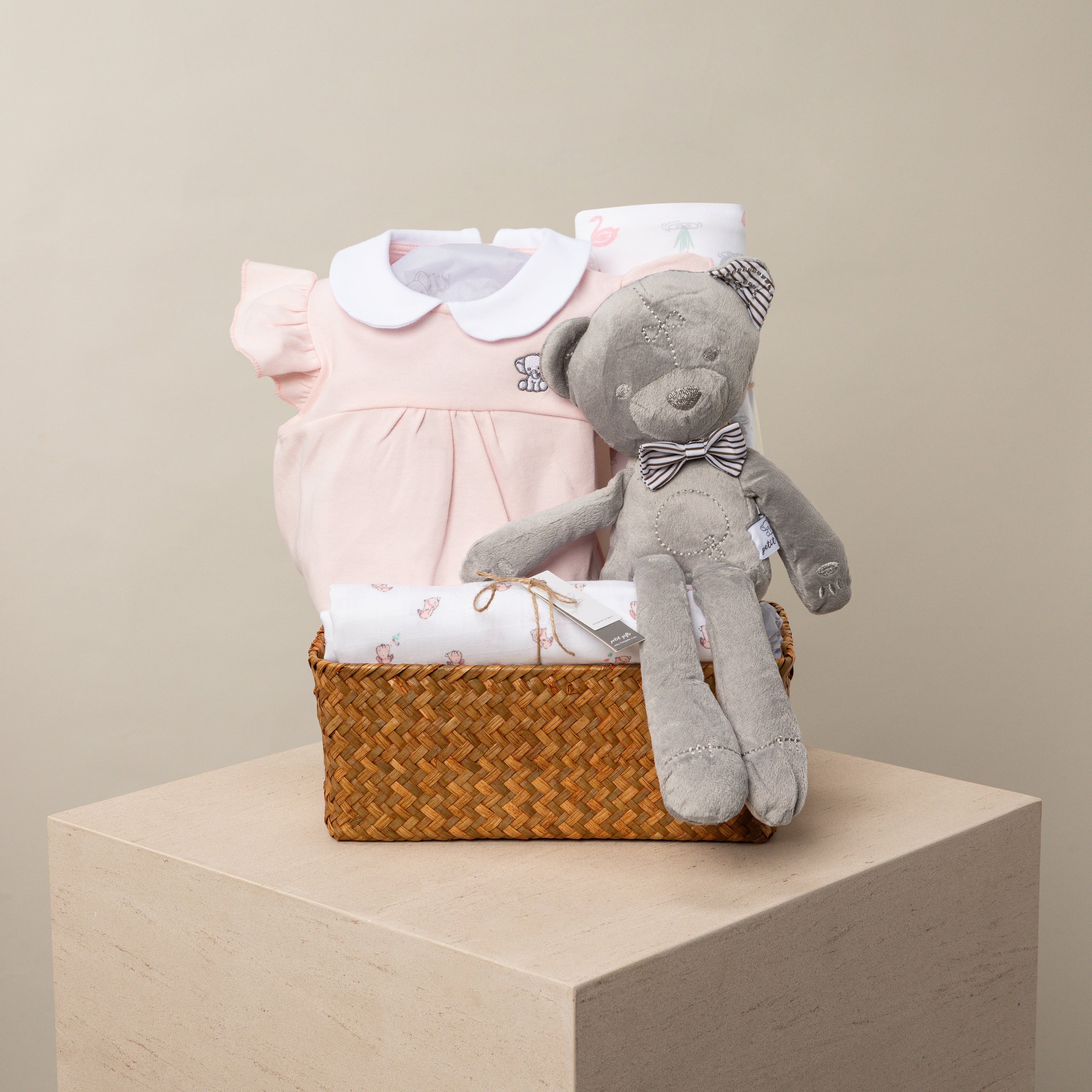 Spoil her with all necessary and adorable items to get started on the right foot when the new little princess arrives and give her this beautiful baby gift basket.